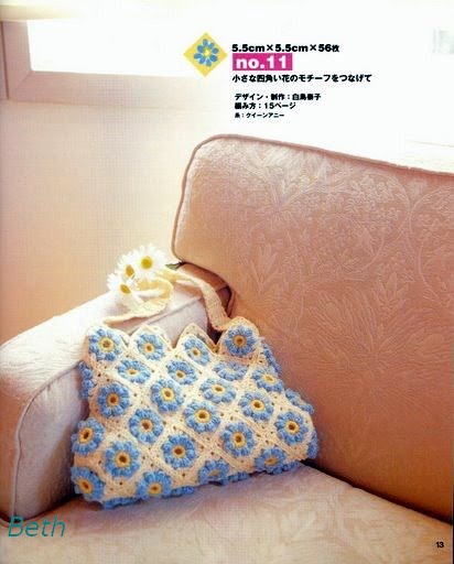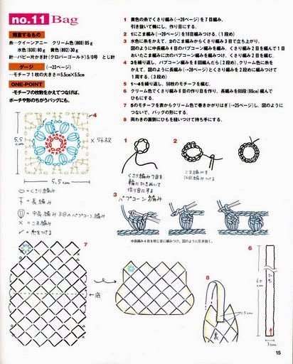Описание: связать цепочку из 25 ВП, вязать 8р. для дна сумки по сх.1, 15р. по кругу по сх.2. после чего боковые части оставить, вязать лицевую и заднюю панели раздельно на высоту 8р.