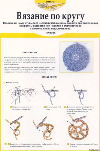 | Вязание по кругу Вязание по кругу открывает неограниченные возможности при выполнении салфеток,скатертей или изделий в стиле пэчворк,а также шляпок,подушечек и пр.